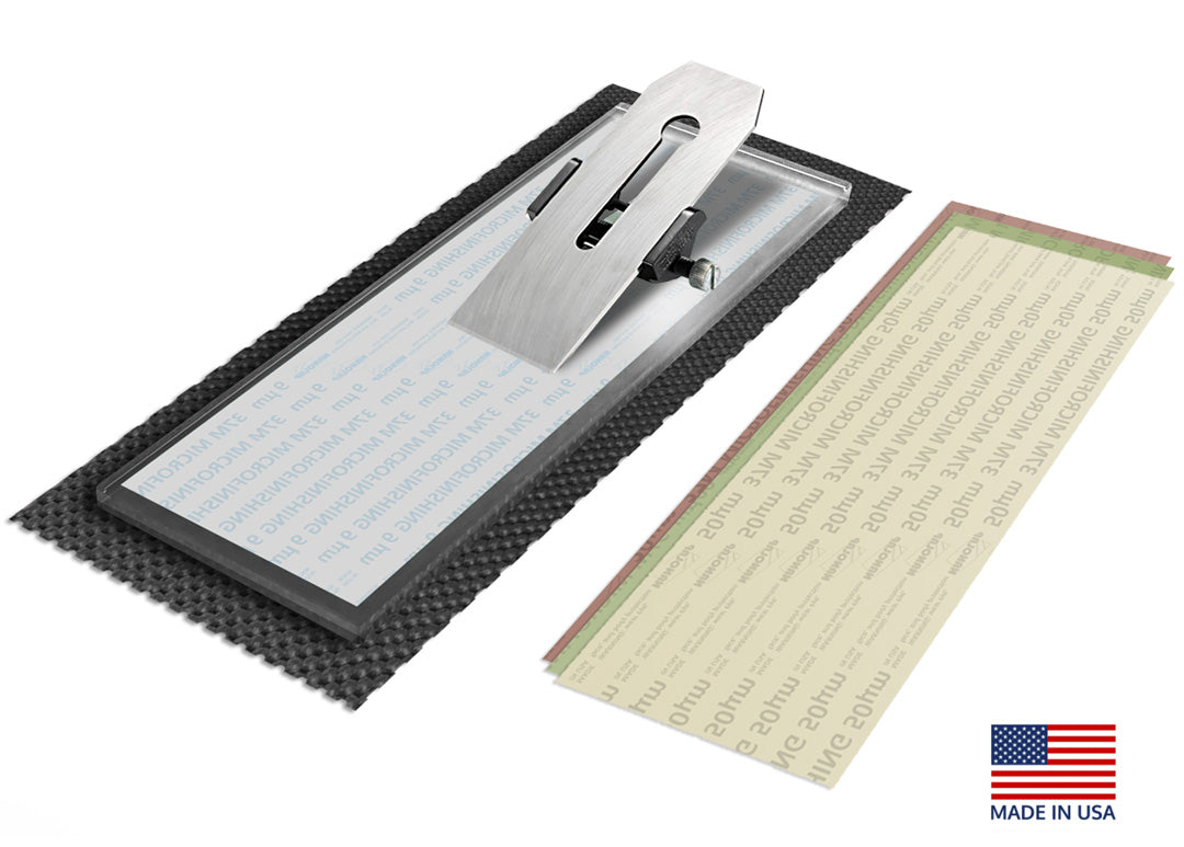 Sharpo's Microfinishing Film have a 5mils thick backing to make the film more durable and less prone to tearing. The adhesive (PSA) backing makes it very easy to use. Simply peel off the paper backing and press it down on glass or other flat, smooth surface.
